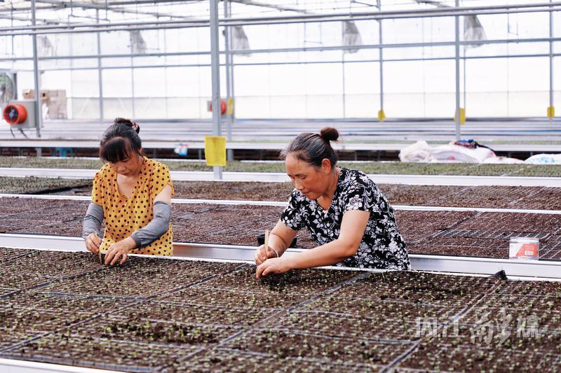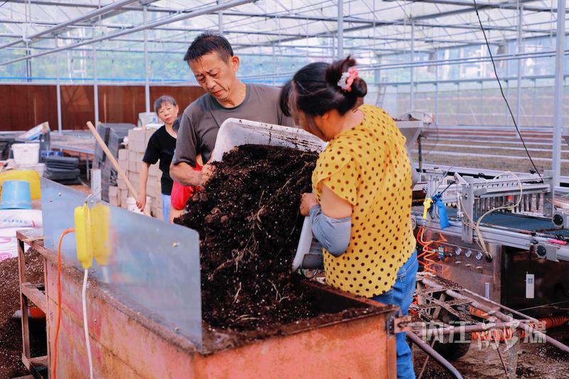 在向义镇水口村精品果蔬育苗基地内,育苗床整齐排列,冒出青翠的嫩芽,工人们正忙着准备有机培土,培育出更多蔬菜苗。