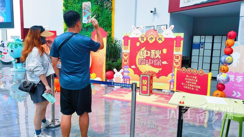 威远县古佛顶旅游景区以其深厚的历史文化底蕴和丰富的活动,吸引了众多文化爱好者。景区推出国风游园活动,古色古香的建筑为游客营造了充满传统文化氛围的游园环境。幸运大转盘活动吸引众多游客参加,丰富的奖品,进一步提升了游客旅游体验;在“诗词歌赋对答”摊位前,游客或沉思,或讨论,热闹非凡;在金马湾驿站,游客凭门票就可领取一份月饼,感受到文旅深度融合带来的别样魅力。