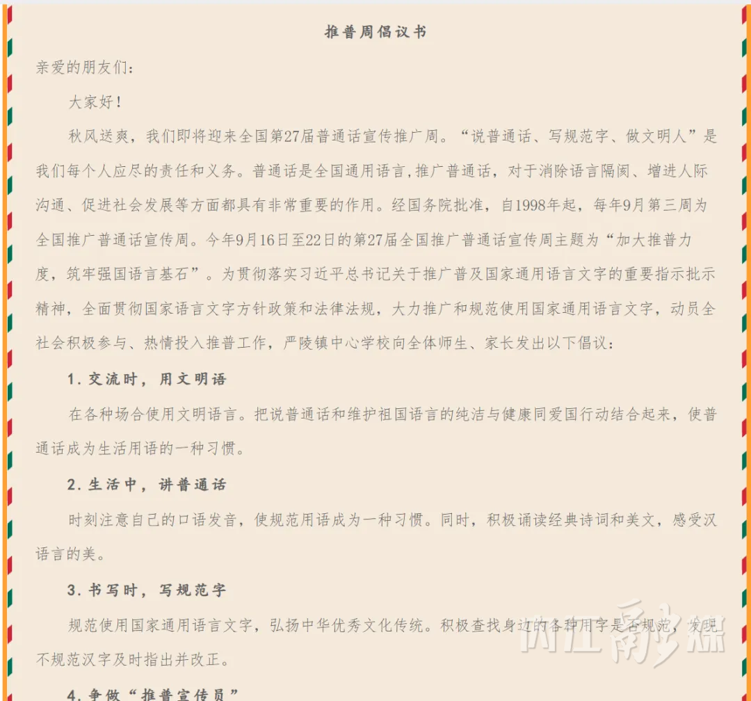 每年9月第三周是全国推广普通话宣传周。9月16日,威远县严陵镇中心学校迎来第27届全国推广普通话宣传周,采取发放倡议书、召开主题班会、诵读经典等方式推广普通话。