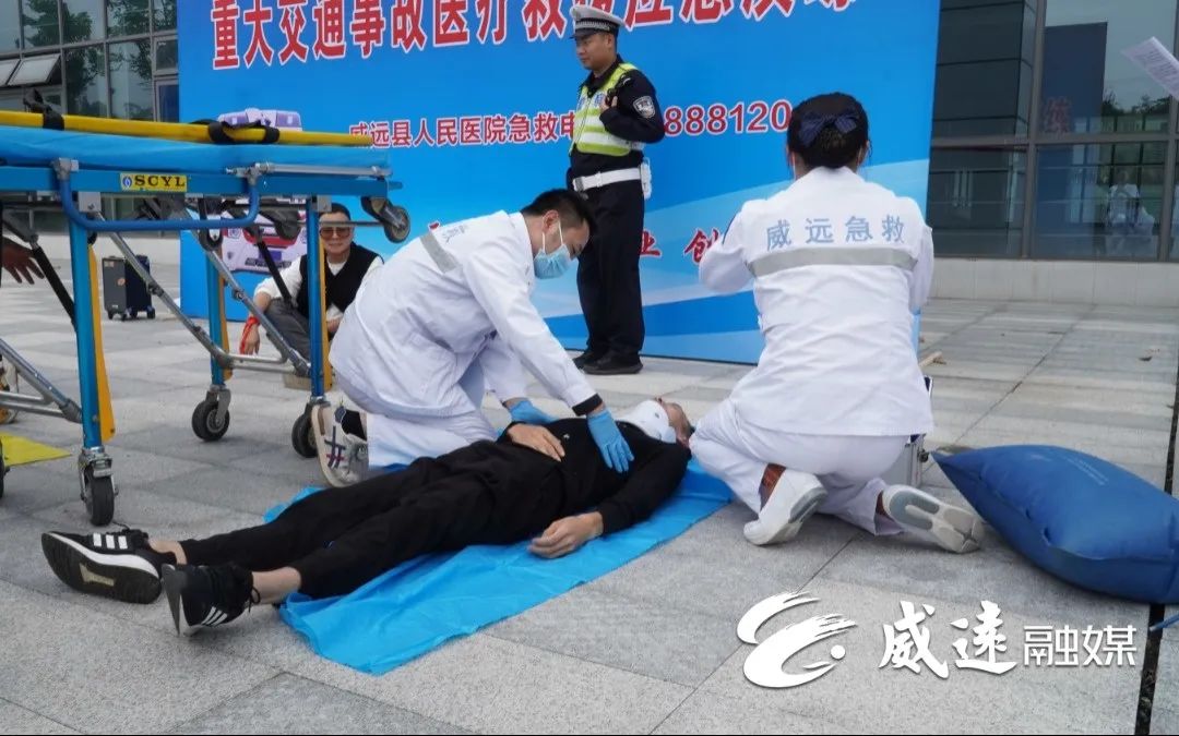 此次演练模拟高速车祸现场内容涵盖院前急诊、院内抢救、危机重症患者绿色通道、器械药品紧急调配、多科室应急联动等多个环节。