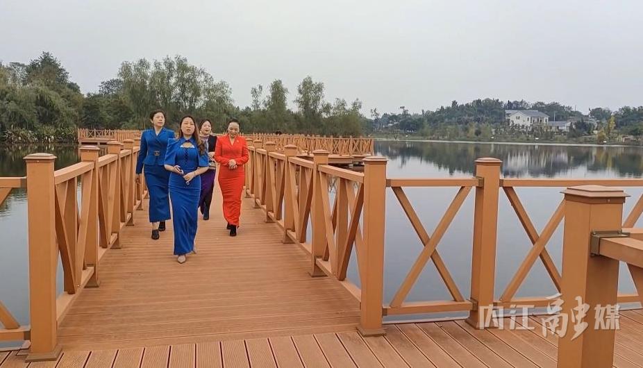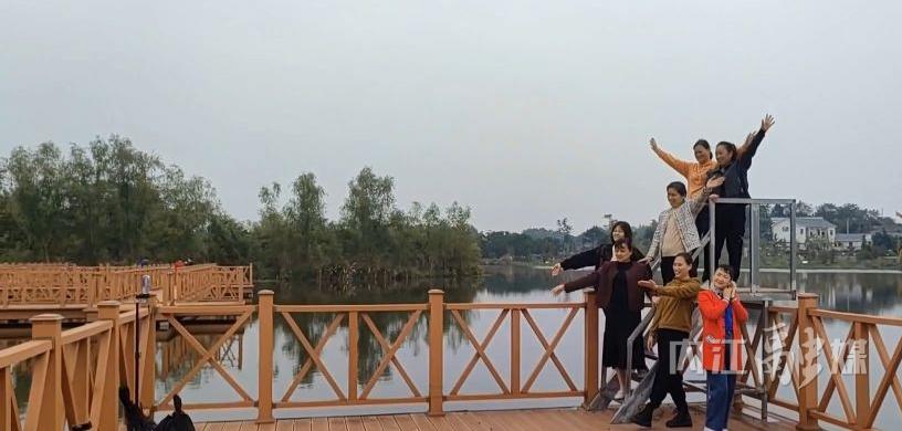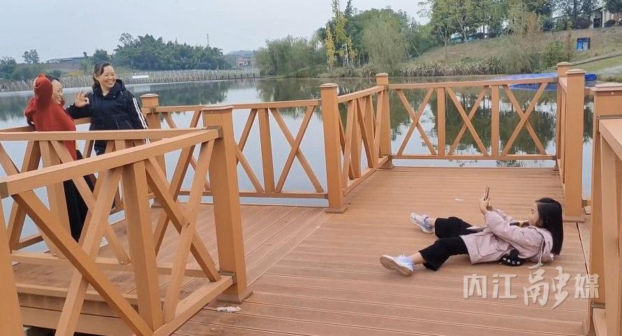 11月3日,记者在位于威远县界牌镇桥凼村的国家AAA级景区康桥恬园看到,游客在湖中木质栈道上高兴地看风景、合影留念。