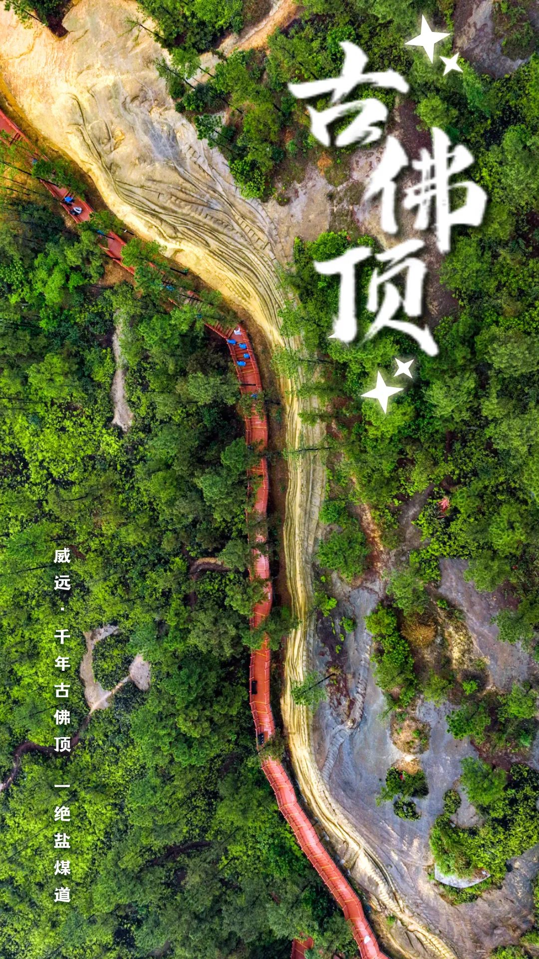 千年古佛顶,一绝盐煤道。威远古佛顶的古道始建于春秋,至今已有2700多年历史,是古川黔经贸大通道和陆上丝绸之路的重要组成部分。古道全长近2千米,它见证了威远煤铁、自贡井盐南来北往的繁盛经贸史,被誉为“山顶上的古高速路”。马蹄哒哒,碾过岁月的洪流,在古道上刻下一道道圆润细腻的窝,回荡着历史的深情。