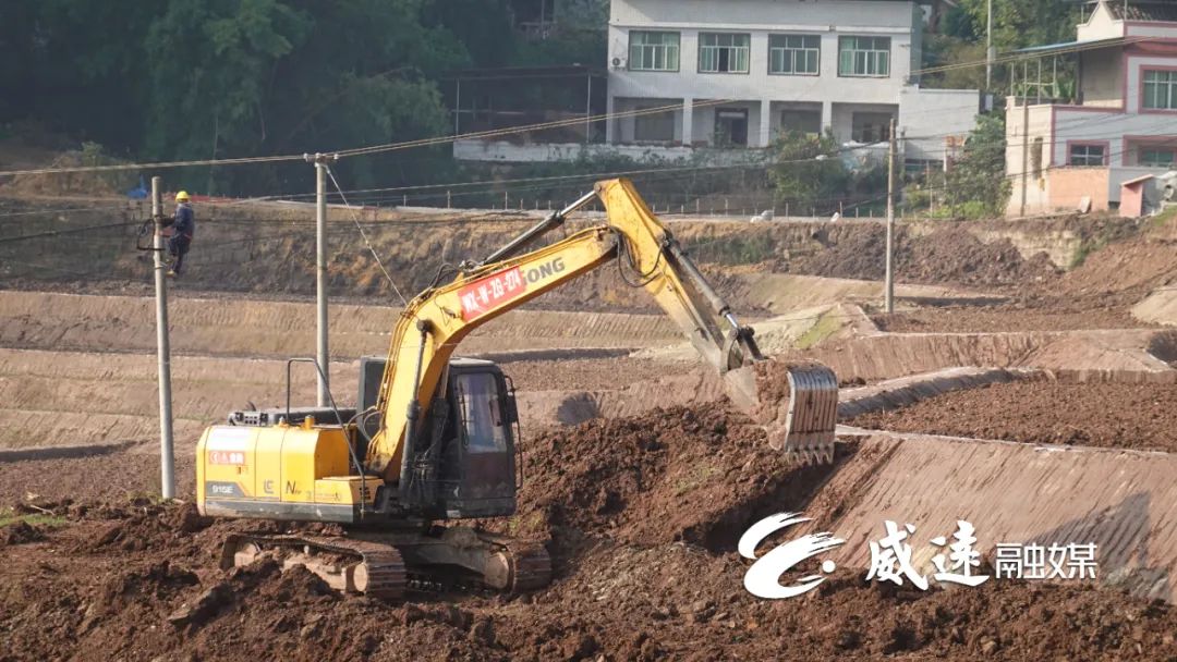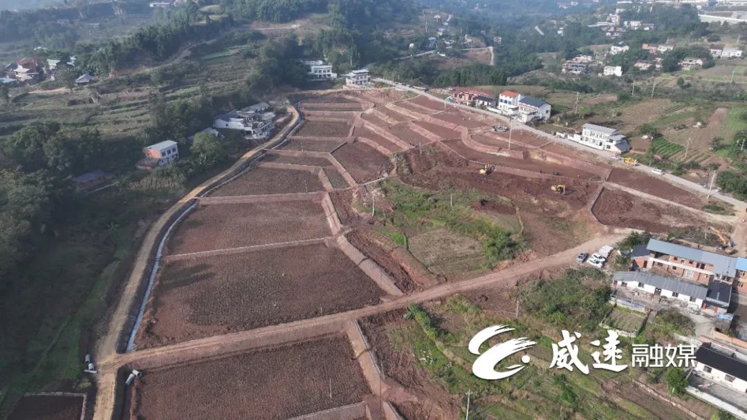 近日,在威远县镇西镇临江寺村,一眼望去,成片相连的土地格局已初见雏形,施工现场大型机械正在进行路基夯实,挖沟开渠等工作,宽阔的土地与正在作业的机械在穹窿大地勾勒出一幅乡村建设的生动场景。