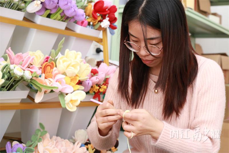 一天,刘莉想起妈妈教给自己的“绝活”——织衣织花。这个活儿既轻巧,又能利用碎片化时间。说干就干!刘莉开始在网上学习织花的品种,并结合妈妈教的手艺,很快就学会了四五种花朵的织法。