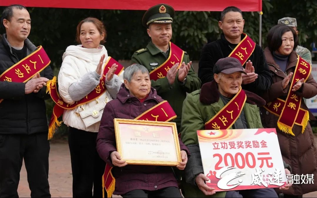 活动现场,鼓声震天,聚集了众多前来庆贺的群众。县退役军人事务局负责人宣读立功受奖军人事迹,军人所在部队及县、镇及部门相关负责人分别为获得二级表彰的军人颁发了立功牌匾,为所有受奖军人及家属代表佩戴了绶带,颁发了立功喜报,发放了奖励金和慰问品。