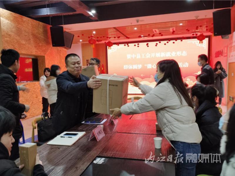 1月5日,资中县总工会在县电子商务公共服务中心开展新就业形态群体圆梦“微心愿”慰问活动,为10名新就业形态劳动者送上“微心愿”礼包。