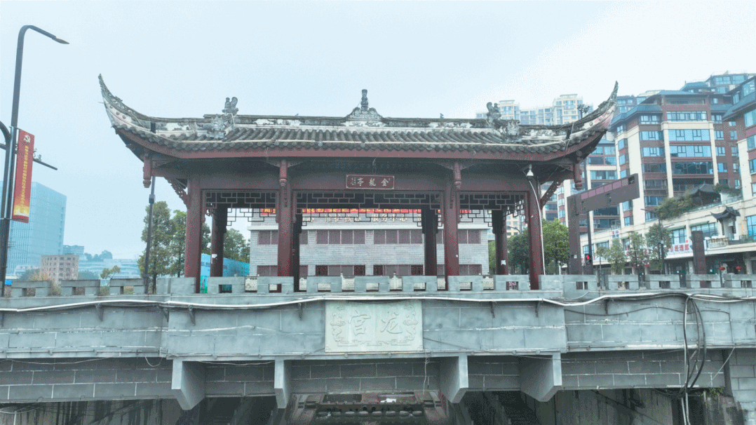 命名缘由:河库联网工程,联通三江九库,引水流经古城水系后,在此艺术性地汇入沱江。联网的水库中,两河口水库水量最丰,作用至尊。在水文化里九座水库皆以龙冠名,两河口水库被冠“金龙”,故将“龙宫”正上方的亭子命名为“金龙亭”以充分彰显该水库的巨大作用。
