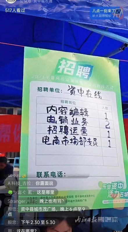 2月25日下午,“乐业资中·活力古城”资中县2023年“春风行动”暨民营企业招聘月活动在城市茂购物广场举行,资中人社部门首场抖音直播招聘拉开序幕。