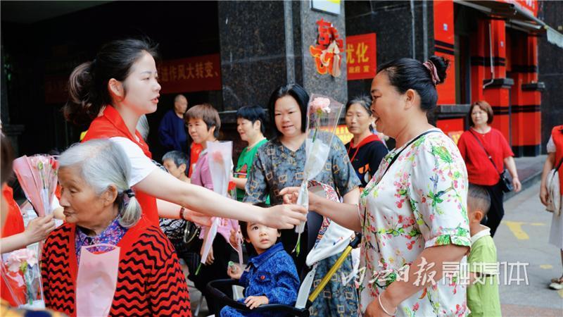 义诊活动当天正值母亲节,社区工作人员、志愿者把提前准备好的饱含祝福的鲜花康乃馨送到每一位母亲手中,表达对母亲真诚的祝福。