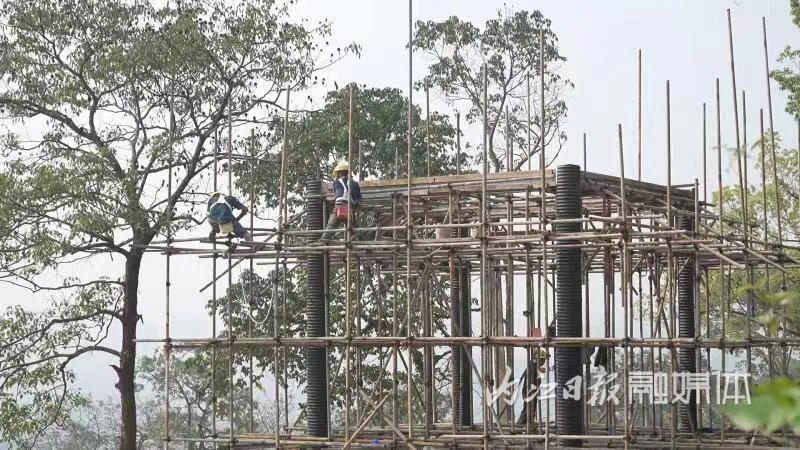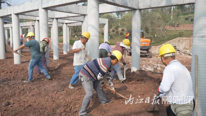 5月17日,记者在资中县重龙山脚下看到,游客接待中心已经完成主体建设,目前在做收尾工作;往上走,倚虹长廊主体结构初见雏形,工人们在回填地面基础。