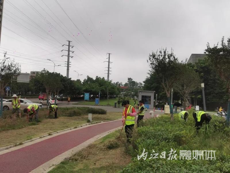 在学府路,工人们使用铲刀、割灌机等工具,集中清理绿化带内的杂草、杂物,同时对不易清理的杂草进行人工拔除。