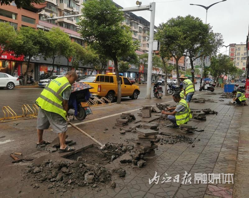 在城南片区土地庙街、长河路等地,工人师傅们正紧锣密鼓地更换人行道地砖,拌浆、填沙、铺平、填砖等工作有序进行。大家分工协作,维修更换人行道路面松动的道板。