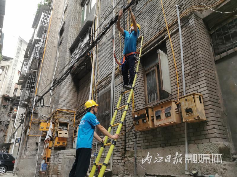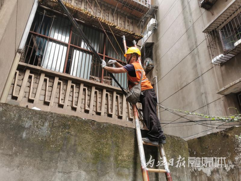 资中电信分公司综合维护组长刘连告诉记者:“电信公司从6月初组织10余名工作人员对城区文庙、西街、小东街等社区的空中飞线进行整治,截至7月19日已完成整治的70%。”