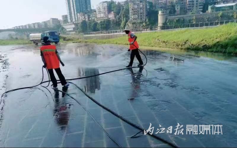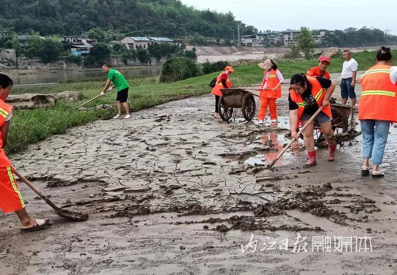 为保障汛期河道畅通,沱江水位刚退,资中县立即启动汛期清淤预案,组织环卫工人和环卫车辆,集中清理亲水平台步道,及时清运堆积的淤泥和杂物。