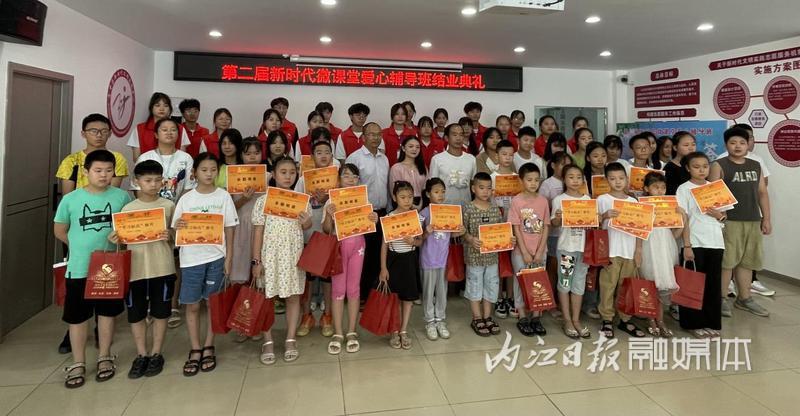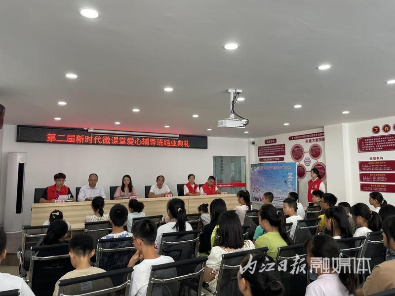 7月31日,资中县第二届新时代微课堂爱心辅导班结业典礼,在县新时代文明实践中心举行。县委宣传部相关负责同志、资中沱江卫士志愿服务队骨干成员、活动赞助企业负责人、大学生志愿者及30余名小朋友参加结业典礼。