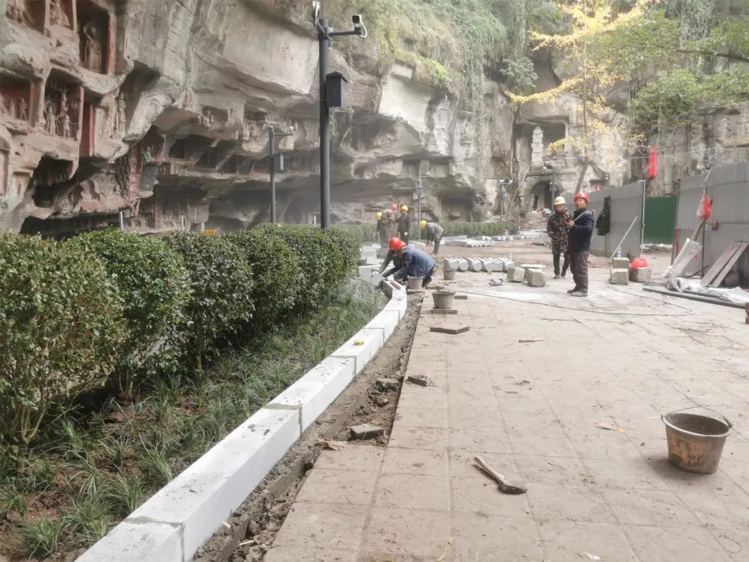 四川省大标建设有限公司现场负责人周勇强:“重龙山摩崖石刻环境整治项目自2023年11月30日进场施工以来,已完成铁栏杆拆除、清淤、水渠恢复、绿化带施工,剩余的青石栏杆安装、卫生清扫、围挡拆除工作于12月30日竣工交付。”
