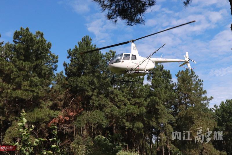 在直升机防治作业现场,相关工作人员严格根据生态环保的有关用药规定,将调配好的松墨天牛高效引诱触杀微囊剂ITK-1药剂注入直升机药箱,按照预定路线在防治区进行防治作业,其中,作业区域包括资中县国有林场种子园、白云山、高桥等林地。