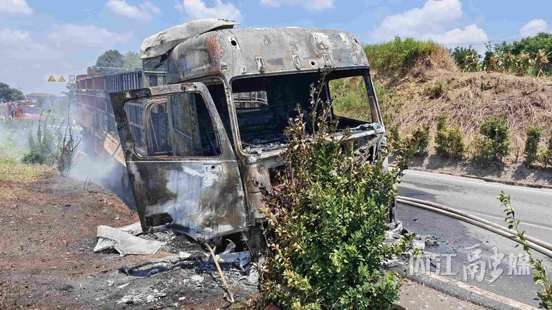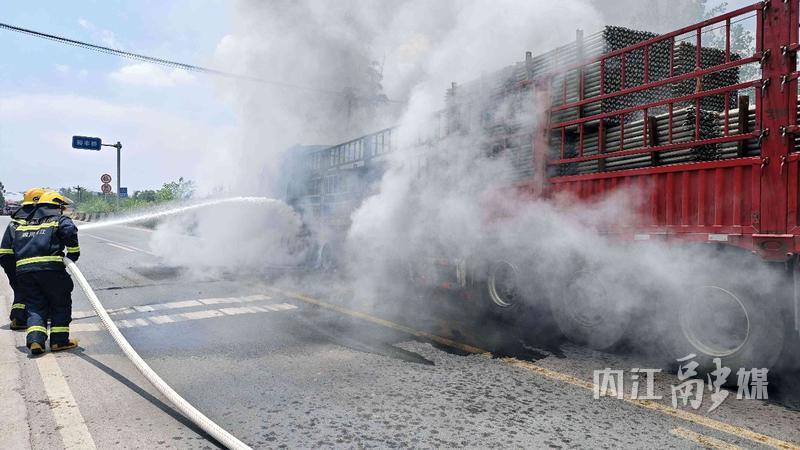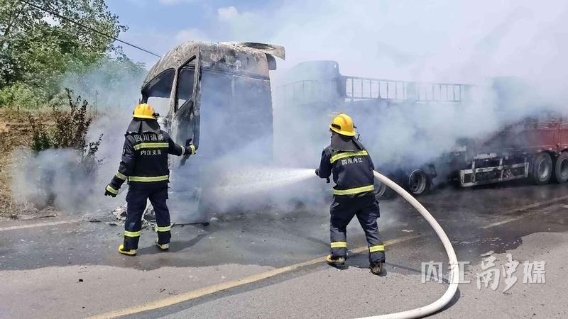 7月31日12时许,G321国道资中高楼至鱼溪路段,一辆挂车在行驶途中不慎将右前轮掉入路边排水沟,随后车辆在高温摩擦下起火,火势迅速蔓延。接到报警后,资中县球溪镇政府专职消防救援站2车10人前往现场展开救援。