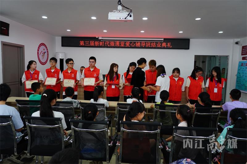 资中沱江卫士志愿服务队队长汪丽、副队长钟丽为微课堂爱心辅导班优秀教师志愿者颁发了证书和纪念品。
