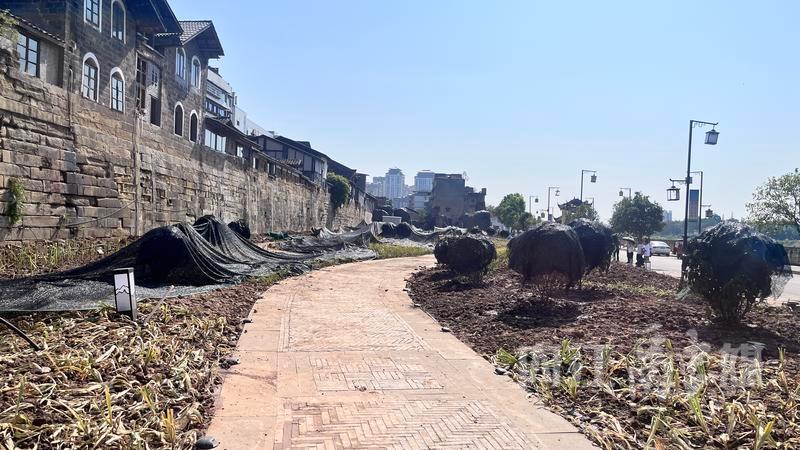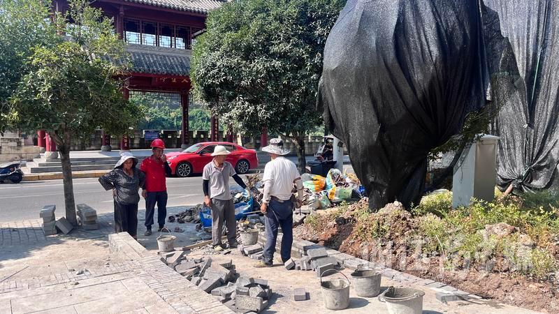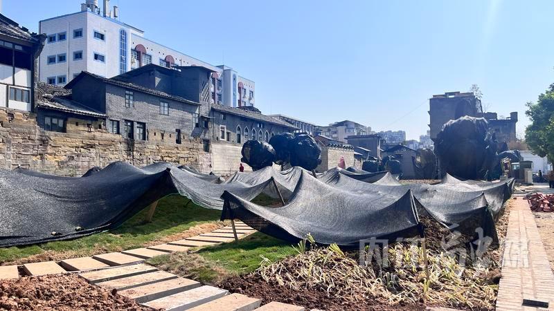 已安装好的古城墙音乐广场景石向行人作“自我介绍”,刚种下的绿植罩着“遮阳网”,广场步行道地砖基本铺设完毕,下沉表演广场已初具雏形。工人们抓紧时间做地砖铺设、灯管安装等收尾工作。