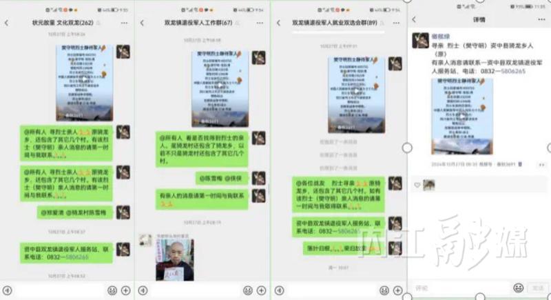 视频发布后不久,这则消息被资中县双龙镇党委书记廖盛华看到。看到烈士生前的家庭住址是四川省内江市资中县骑龙乡时,廖盛华觉得该烈士极有可能是双龙镇人,便与县退役军人事务局取得联系。